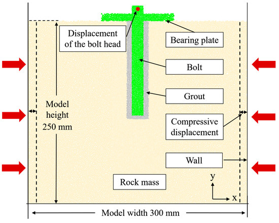 The numerical model was developed according to the dimensions of rock mass as described above, and parameters were assigned to surrounding rocks. Afterward, a confining pressure of 1.0 MPa was applied to allow consolidation and equilibrium of the model. Then, corresponding parts of the model were regrouped according to the locations of the grout, bolt, bearing plate, and fracture, to which corresponding microscopic parameters were assigned. This was followed by re-equilibrium to generate the initial model needed for computation. The numerical model with a size of 300 mm × 250 mm is shown in Figure 3, and the total number of particles was 35,000. To ensure the comparability of different computation schemes, the length of the bearing plate was set to 100 mm. In the computation, a displacement constraint was applied to the bottom of the model. To alleviate the end effect, the coefficient of friction between walls on the left and right sides and balls of surrounding rocks was set to 0. Horizontal speeds of 0.01 mm/s were used while opposite directions were applied to walls on both sides to compress surrounding rocks. In the model with fractures, balls at the location of fractures were directly deleted to simulate the prefabricated fractures. The horizontal stress on walls on both sides was monitored in the computation process. When the stress on the walls reached a peak and began to decrease, it meant that the anchorage system had failed. At that time, the computation was ended.