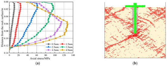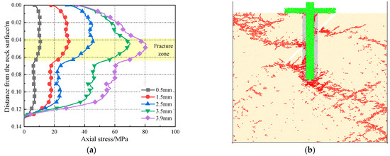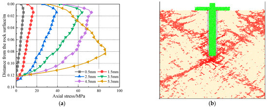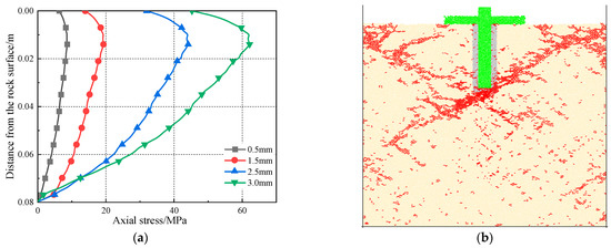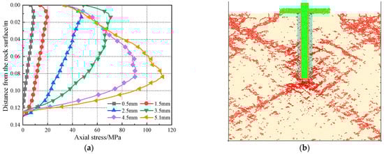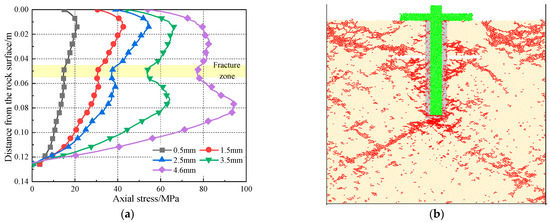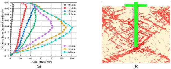 The stress distributions of bolts that are 80 and 180 mm long are displayed in Figure 9a and Figure 10a. Combining this with the stress distribution on the bolt with a length of 130 mm (Figure 5a), it is found that, as the rock mass is compressed, stresses on bolts of different lengths all increase and then tend to decrease. When the bolt length is 80 mm, the peak stress on the bolt is not transferred to greater depth; this is because the bolt is relatively short, so it can only improve the bearing capacity in a small range of rock mass. Therefore, many fractures occur in the shallow part when the rock mass is compressed to a small displacement (3.0 mm)(Figure 9b), and shallow surrounding rocks fail. When increasing the bolt length to 130 mm and 180 mm, the locus of peak stress on the bolts shifts to greater depth. In addition, the longer the bolts are, the larger the maximum compressive displacement (separately 5.1 mm and 6.0 mm) and the higher the peak stress intensity thereon. This indicates that the bolt length only slightly affects the stress distribution law while greatly influencing the peak stress intensity in the bolts and the maximum compressive displacement of the rock mass.
