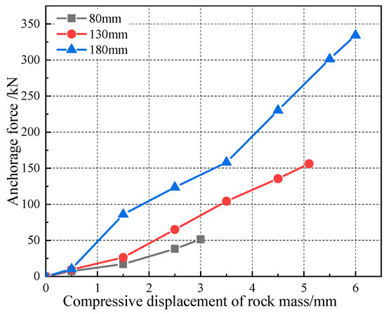 Changes in the anchorage force of bolts with different lengths with the compressive displacement of anchored rock mass are shown in Figure 11. The figure shows that with the compression of anchored rock mass, the anchorage force of all bolts gradually increases. Under the same compressive displacement of the rock mass, the longer the bolts are, the greater the anchorage force thereon. As the bolts are increased in length, the maximum anchorage forces are separately 51 kN, 156 kN, and 334 kN; this indicates that the bolt length significantly affects the anchorage force provided by such bolts.