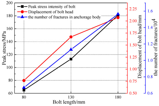 The values of evaluation indices for the support capacity of bolts with different lengths are displayed in Figure 12. It can be seen that the peak stress intensity of bolts, displacement of the bolt head, and number of fractures in anchored rock mass are positively correlated with the bolt length. Combined with changes in the maximum anchorage force, increasing the bolt length can increase the anchorage force of bolts, enable the rock mass to withstand greater damage, and avoid premature failure, while it also increases the displacement of the bolt head and peak stress intensity on the bolts. As a result, the bolts are easily broken or pulled out.