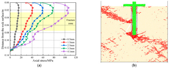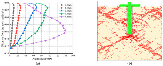 Stress distribution on bolts with a diameter of 12 mm and fracture distribution in the anchored rock mass. (a) Stress distribution of bolts; (b) Fracture distribution at failure.