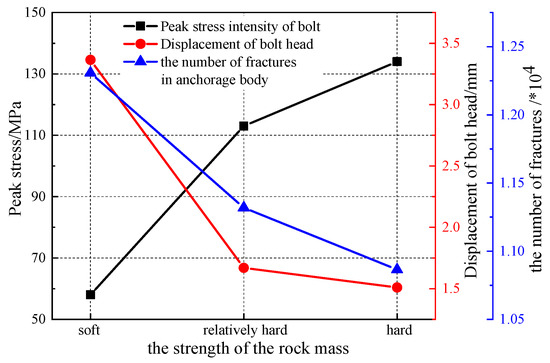 Figure 16 shows the values of evaluation indices for the support capacity of bolts in a rock mass with different strengths. It can be seen that as the strength of the rock increases, displacement of the bolt head and the number of fractures in anchored rock mass both gradually decrease, while the peak stress on the bolts gradually increases. Changes in the maximum anchorage force reveal that bolts of the same type show stronger anchoring capacity in a stronger rock mass; the deformation of the rock mass is smaller, while the peak stress intensity in the bolts is larger. Hence, the engineer should appropriately enlarge the bolt diameter while reducing the peak stress intensity in a hard rock mass to avoid breakage of the bolts; in a soft rock mass, it becomes necessary to enlarge the bolt length or diameter to improve the anchoring capacity of bolts and decrease damage to the rock mass.