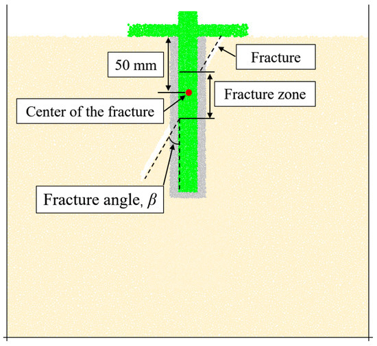 Fractures, as an intrinsic component of rock mass, also affect the mechanical properties of the bolts. The fracture angle (the angle between a fracture and a bolt) was set to 90°, 60°, 45°, and 30°, of which the computations are represented by Schemes 8 to 11 in Table 1. In the computation, fractures were formed by directly deleting balls. The fractures were 90 mm long and 3 mm thick, with centers at the same location on the axis and 50 mm from the free face. Due to the different fracture angles, bolts are intersected by fractures within different ranges, in which the bolt stress is always affected by fracturing; this range is called the fracture zone, as shown in Figure 17.