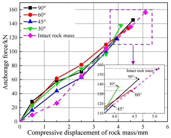 Changes in the anchorage force of bolts in anchored rock mass containing fractures with different angles with the compressive displacement of rock mass.