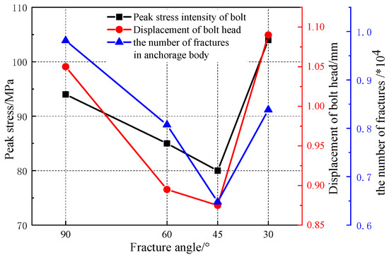 The values of evaluation indices for the support capacity of bolts in anchored rock mass containing fractures with different angles are illustrated in Figure 23. As the fracture angle decreases, all indices reduce at first and then increase. When the fracture angle is 45°, all indices are minimum. This implies that although the peak stress intensity is minimum and bolts are not likely to be broken when the angle between bolts and fracture is 45°, the anchoring effect is poorest, and anchored rock mass fails as long as the anchored rock mass suffers minor damage. Therefore, it needs to avoid an angle of 45° between bolts and pre-existing fractures during support.