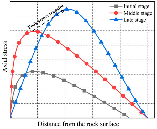 The above analysis reveals that different factors all influence the mechanical properties of bolt supports. The stress distributions of bolts are similar for different bolt diameters and lengths as well as strengths of the intact rock mass, and influences of these factors on the anchorage force are also similar. The stress distribution along such bolts in an intact rock mass is shown in Figure 24, in which the stress increases at first, then decreases along the bolt; the stress gradually increases and the peak shifts to a greater depth with the damage to the anchored rock mass. The stress distribution does not change when increasing the bolt diameter and length as well as the strength of the rock, while only the stress changes. In the meantime, the corresponding maximum anchorage force of bolts also increases.