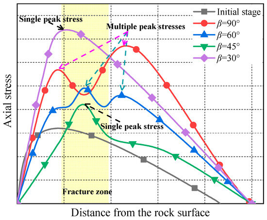 The stress distributions along bolts under a fracture angle of 30° are illustrated in Figure 21a. It can be seen that the stress distribution is similar to that in an intact rock mass; that is, the stress increases and then decreases. The bolt stress in the fracture zone does not decrease or increase abruptly. Throughout the loading process, the bolt stress has the only peak value, which is located in front of the fracture zone, and it does not shift to greater depth.