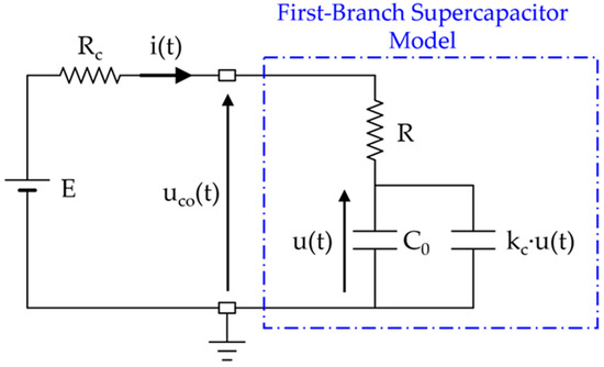 Among the models based on electrical circuits that have been presented by other researchers, two are particularly suitable to be used in most industrial applications, combining simplicity and good accuracy. The one-branch variable-capacity model (Figure 1b) is valid for the study of short-term behavior, while the two-branch model shown in Figure 1c is suitable for characterizing the behavior from short-term to medium- to long-term operation. Both models do not require the calculation of many components, as in more complex approaches, and provide sufficiently accurate results for most studies requiring the analysis of SCs. However, manufacturers do not provide the values of all the parameters of these models, so estimation procedures from laboratory tests have been developed in previous studies. These methods typically use charging or discharging the cell with a very high constant current source.