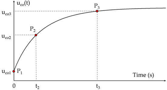 The external voltage as a function of time during cell charging will produce a curve like that shown in Figure 3. Three measurements will be taken at sufficiently distant points in time, whose values will be P1 = (0, uco1), P2 = (t2, uco2), and P3 = (t3, uco3). It is assumed that the initial sample will be collected at t1 = 0 s. If the value of the voltage source, E, is added to both members of the function t(uco) presented in (15), the relationship between the time t and the external voltage uco is expressed as follows: