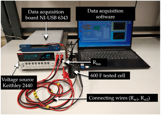 As the source can supply a maximum current of 5 A, a series resistor, Rlim, of 496.7 mΩ was connected to limit the current set when the source is turned on. The resistances of the wires leading from the Rlim resistor to the SC were also measured; their values are Rw3 (positive) and Rw4 (negative). Given that the wires and connectors are not identical, the resistances Rwj (j = 1, 2, 3, 4) are different. To achieve the highest precision in measuring these low resistances, a 4-wire connection was employed. The values obtained are presented in Table 1, where the initial internal voltage of each cell, U0, is also shown. In consideration of the diagram depicted in Figure 2, the resistance Rc used in the theoretical formulas described in Section 3 is equal to: