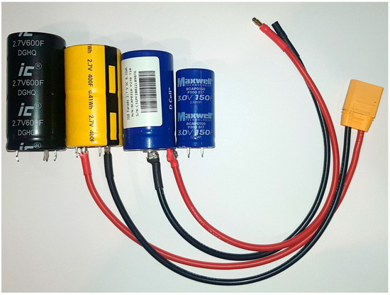 Tested SCs (capacitances of 150 F, 310 F, 400 F, and 600 F). For the 400 F and 310 F cells, the resistance value of the connection cables (Rw3, Rw4) has been considered.