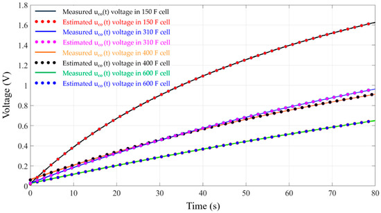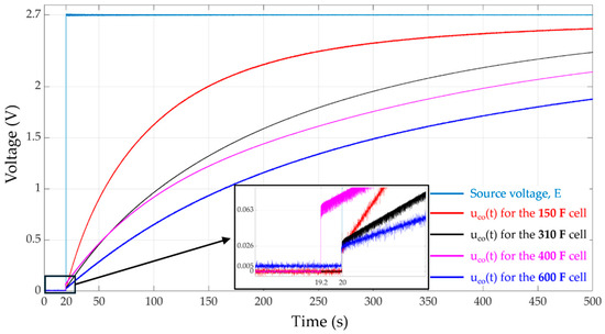 Figure 7 illustrates the uco(t) voltage evolution, in the four cases, where the cells were connected to the RVS with E = 2.7 V. The SCs started with a zero initial voltage, except for the 600 F cell, which exhibited a residual voltage of 5 mV derived from previous tests. The source was activated 20 s after the beginning of data acquisition (19.2 s for the 400 F cell). The initial external voltage, uco1, is dependent on the values of the resistances of the wires connecting the cell (Rw1, Rw2, Rw3, and Rw4). This is demonstrated in (17) and (38).