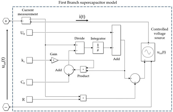 In both ways, the external voltage can be calculated. The second option can be easily modeled with a simulation program. Figure 9 shows the block diagram created with SimulinkTM to reproduce the behavior of an SC considering only the main branch of variable capacitance, which will need the three parameters of the model (R, C0, and kc) and the value of the initial internal voltage, U0. Connecting this block to a real voltage source (E, Rc) identical to the one used in the experimental tests, the theoretical value of the external voltage, uco(t), will be obtained.