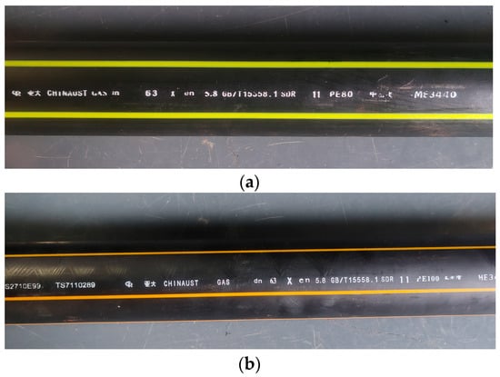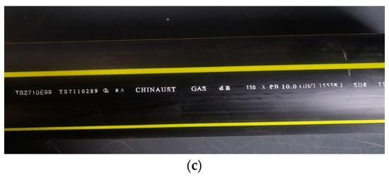 At present, PE pipes are mainly used for medium- and low-pressure gas transport [14,15,16,17]. Commonly, the design pressure of these PE pipes is 0.4 MPa and the operating pressure is 0.2 MPa. SDR11 DN63 PE80, SDR11 DN110 PE80, and SDR11 DN63 PE100 pipes produced by the same company were used in the thermal oxygen accelerated aging experiments mentioned in this paper (Figure 1). In the aging experiments, the DN63 pipes should be longer than 320 mm and the DN110 pipes should be longer than 490 mm.