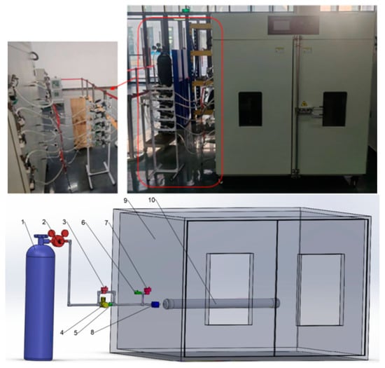 Aging experimental platform: 1—nitrogen cylinder; 2—cylinder regulator; 3—pressure-raising solenoid valve; 4—regulator; 5—pressure-raising ball valve; 6—pressure-reducing ball valve; 7—pressure-reducing solenoid valve; 8—electronic barometer; 9—thermo-oxidative aging chamber; and 10—polyethylene pipe.