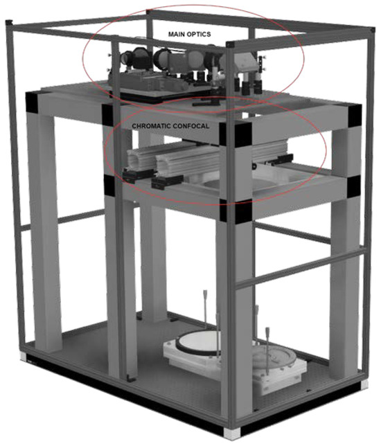 The chromatic confocal sensor was purposefully designed to integrate into an existing optical setup for the wave front phase measurement of 300 mm diameter optics (Figure 1), developed in [24].