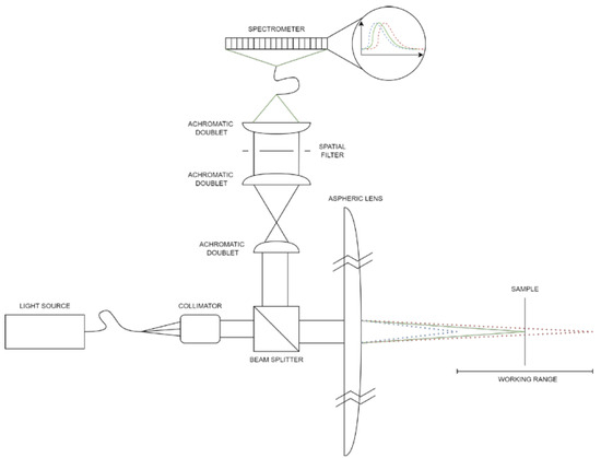 The experimental setup is shown in Figure 2. The sensor can be split into four main components: illuminator, collector, signal conditioner, and spectrometer. The illuminator path consists of a Tungsten-Halogen Light Source (SLS201L, Thorlabs, Newton, NJ, USA), which delivers a consistent intensity spectrum of 10 mW black-body-like radiation, spanning from 360 to 2600 nm, coupled to a multimode 50 µm core optical fiber patch cable. The other end of the optical fiber is at the focal plane of a positive achromatic doublet lens of 100 mm focal length. The broadband collimated beam emerging from the collimator passes through a 50/50 non-polarizing beam splitter and finally is focused by a large singlet aspheric lens made of BK7 glass; the most relevant optical parameters are shown in Table 1. The singlet design of this lens causes a large focal shift between the extremes of the spectrum. The sample is typically placed at the midpoint of this range.