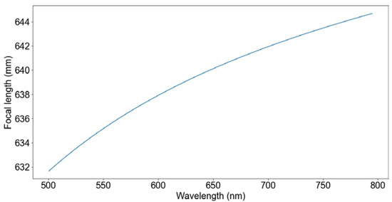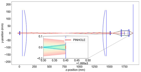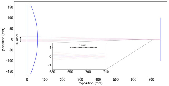 The working distance of our system corresponds to the effective focal length of the primary aspheric lens, measuring 620 mm for a wavelength of 590 nm. It is worth mentioning that even if the aspherical shape of the main lens is aimed to decrease the spherical aberration it does not remove entirely. Furthermore, the confocal sensor uses a small portion of the center of the lens, as shown in Figure 4, and so the focal lengths for different wavelengths will be larger than those given in the specifications of the lens. In Figure 5, the focal lengths for the marginal rays of an incident light with a diameter of 25.4 mm are shown. In addition, it is important to note that the central rays of the collimated light incident on the main lens will have even higher focal lengths and extend the working range of the sensor even further, which is why the last optical relay was introduced, to magnify the collimated light after reflection on the sample and to introduce a spatial filter to block these rays (see Figure 6) and maintain the desired working range.