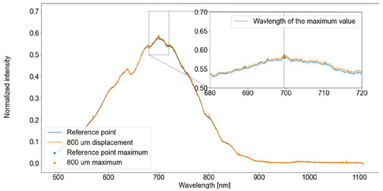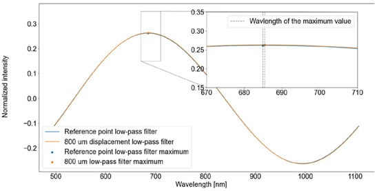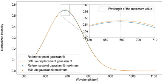 Figure 8 shows two spectra that were captured at two separate positions of the sample, separated by 800 µm. Even though the spectrum has changed, the maximum value lies in the same wavelength, thus demonstrating that the detection of the peak wavelength in a raw spectrum signal is not enough even to resolve a large distance. To mitigate this issue, two distinct methods were employed: low-pass filtering and Gaussian fitting.