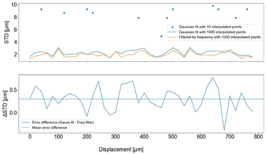 Each displacement was executed in increments of 20 µm. At each position, three thousand spectra were captured, and the averages of each one hundred spectra were computed to enhance the signal-to-noise ratio (SNR), resulting in thirty spectra per displacement. In Figure 12, the standard deviation (STD) for each sample position, based on 30 captured spectra, is compared. The upper section of the figure illustrates that the Gaussian fit generally exhibits a higher STD value across most of the sample positions, with the exception of two. The lower section displays the result of subtracting the frequency filter curve from the Gaussian fit curve. This difference shows that, apart from two sample positions, the values are predominantly positive, indicating that the uncertainty associated with the Gaussian fit is, on average, greater than that of the frequency filter within the examined range. The “Gaussian fit with 10 interpolated points” are scattered points, since some standard deviation values had a value of zero as no peak movement was detected, which is the same effect that is illustrated in Figure 8. The mean standard deviation with the largest oversampling outperforms the one with fewer interpolated points by a factor of 3.8.