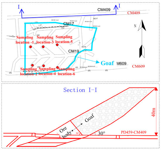 It can be seen from the field investigation results that the roof of the goaf has collapsed, and the interior of the goaf is full of crushed stone, which meets the basic conditions for the formation of a GCB by the grout filling method. Then, crushed stone in the goaf was sampled to study its characteristics and different factors affecting the GCB and determine the ratio of the slurry. Considering factors such as surrounding rock conditions, staff safety, and transportation difficulties, on the premise of ensuring the validity of sampling, the sampling location was finally determined to be the part of the goaf in the middle of the CM409–CM609 exploration line, specifically, the drawing funnel positioned by the original open-stope method (Figure 1).