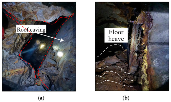 Status of the goaf and its adjacent roadway. (a) The roof of the goaf has fully collapsed. (b) Floor heave occurs in the roadway near the goaf.
