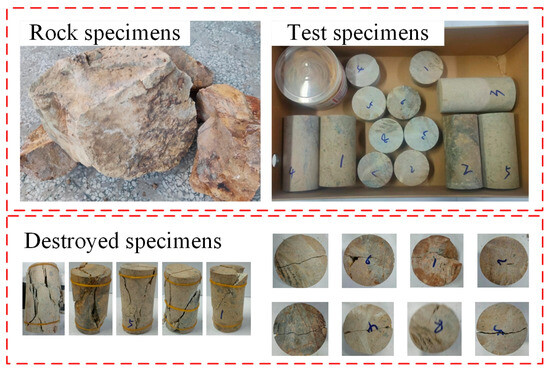 According to the requirements of the uniaxial compressive strength (UCS) test and Brazilian splitting test specimens in the Standard for Tests Method of Engineering Rock Mass [24], large crushed rock blocks obtained from the goaf were processed into specimens, grouped, and numbered. Finally, their mechanical parameters were obtained by mechanical tests in accordance with the test requirements (Figure 3). The RMT-150B rock mechanical test system was used for the UCS test, while the YES-300 pressure testing machine (Tianshui Hong Shan Testing Machine Co., Ltd., China) was used for the Brazilian splitting test. The UCS test was performed on cylindrical specimens (height 100 mm, diameter 50 mm) at a loading speed of 0.5–1.0 MPa/s until the specimen failed, during which the longitudinal and transverse displacements under various stress levels, as well as the maximum failure load, were recorded. The Brazilian splitting test was performed on cylindrical specimens (height 30 mm, diameter 50 mm) at a loading speed of 0.3–0.5 MPa/s until specimen failure, during which the maximum failure load was recorded. The failure modes of the specimens are illustrated in Figure 3.