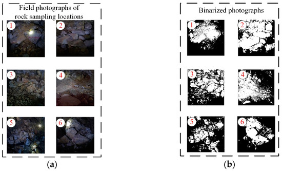 To study how the crushed-stone particle size influences the strength of the GCB, 100 × 100 × 100 mm3 cubes were selected as the specimen size. According to the Standard for Test Methods of Physical and Mechanical Properties of Concrete [28], when the cross-sectional size of the specimen is 100 × 100 mm2, the maximum particle size of aggregate is 31.5 mm. Accordingly, it was determined that the particle size of aggregate in this test lies in three ranges, i.e., <10 mm, 10–20 mm, and 20–30 mm. Based on field investigation, it was found that no obvious interval exists in the crushed-stone particle size in the goaf, indicating that the distribution of crushed-stone particle size shows continuous grading. Under the condition of continuous grading, the crushed-stone particle size has an essential influence on the mechanical properties of the GCB. To reduce the adverse impact of difference in crushed-stone particle size between the engineering field and the laboratory test on the test results, photographs of crushed stone were taken at the sampling positions first. Next, the crushed-stone regions in the photographs were binarized with the aid of MATLAB (R2014b) (Figure 4) and subjected to fractal dimension identification. Eventually, according to the identification results, the mass ratios of crushed stone at the three particle size levels under different fractal dimensions were obtained in the light of Talbol’s theory [29]. With the above method, the following results were yielded: the fractal dimensions of crushed stone at the sampling positions lie between 0.62 and 0.65, mainly concentrated at 0.64, and those of crushed stone in this experiment are classified into four levels, i.e., 0.62, 0.63, 0.64, and 0.65.