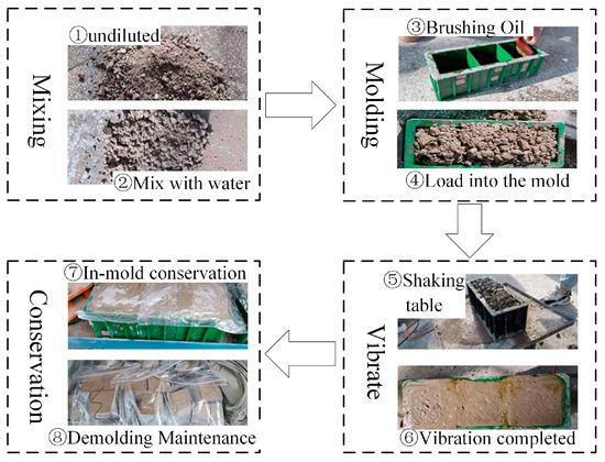 Given that good quality of GCB specimens is a prerequisite to ensure the accuracy of the tested GCB strength, the GCB specimens were prepared in strict accordance with the operating procedure (Figure 5) [28]. First, according to the design ratio of the GCB, the required materials and test tools were prepared simultaneously. Next, water, stone, sand, and cement were taken according to the ratio and mixed evenly and fully. Afterwards, the inner wall of the mold was brushed with lubricating oil, and the mixture was placed into the mold which was then vibrated on a vibrating table. When the GCB was about to solidify, it was smoothed with a spatula. Immediately after the formation of the specimen, its surface was covered with impermeable film, and the mold was removed after the initial solidification of the specimen. Finally, the specimens were numbered and cured for 28 days by the natural curing method. It is noteworthy that they were not allowed to be moved during the curing period.