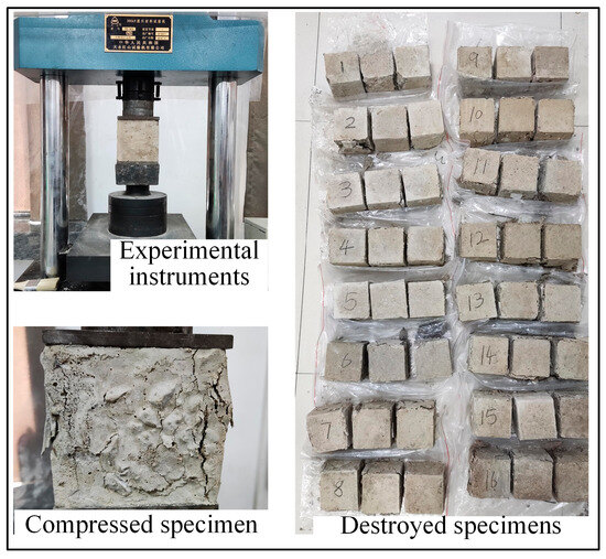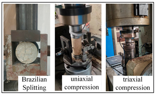 Upon the completion of specimen curing, the specimens were removed from the curing site, inspected, and measured. The specimens that met the test requirements were subjected to the triaxial compressive strength test on the RMT-150B rock mechanical testing system and the Brazilian splitting test on the YES-300 pressure testing machine, and the experimental process is given in Figure 14.