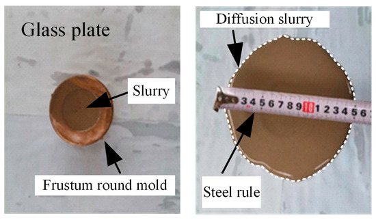 The fluidity of the slurry is a prerequisite for the pumpability of the grouting cementing material, and it also ensures better diffusion of the slurry in crushed stone in the goaf. The fluidity of the slurry was tested by the following method. First, the prepared cementing material was mixed evenly with water at the fixed water–cement ratio, and then the slurry was poured into the conical cut-off mold. With the liquid surface kept flush with the upper part, the cut-off mold was lift vertically, so that the slurry could flow freely on the glass plate. Thirty seconds later, the maximum diameter of the slurry flow was measured with the scale and regarded as its fluidity. The test procedure is presented in Figure 7.
