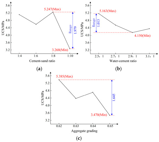 The average value of the test results for each factor and level was taken. Subsequently, the sensitivity analysis curves of factors influencing the UCS of the GCB were plotted with the UCS as the vertical coordinate and the levels of different influence factors as the horizontal coordinate (Figure 8).