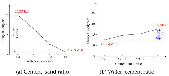 As can be seen from Figure 9, cement–sand ratio is the primary factor that affects slurry fluidity, and water–cement ratio is the secondary factor. Additionally, the optimal ratio of the slurry to achieve a high slurry fluidity is a water–cement ratio of 3.1:1 and a cement–sand ratio of 1:4.