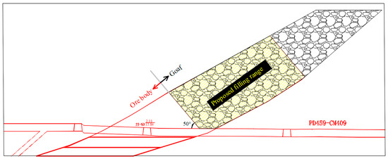 To achieve the dual purpose of safely mining the ore body around the goaf and preventing the crushed stone from mixing with the extracted ore, the slurry is injected into the goaf by boreholes so that the crushed stone in the goaf adjacent to the ore body is cemented into a whole and is endowed with a certain degree of support, thus increasing the stability of the surrounding rock. Based on the geological profile of the study area, a schematic diagram of grout filling of crushed stone in the goaf was drawn (Figure 10).