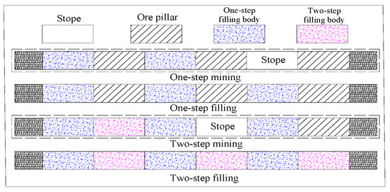 The ore body below the GCB in the goaf is mined using the horizontal layered dry filling method (chamber size 3.3 m × 3.3 m). The mining process can be roughly divided into four steps, namely one-step mining, one-step filling, two-step mining, and two-step filling (Figure 11).