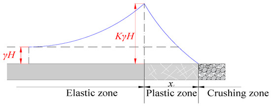 By analyzing the position of the GCB in the goaf (between the ore body and the crushed stone in the goaf), as well as the mining method and mining room layout for the part of the ore body to be mined, the GCB to be formed can be regarded as an ore pillar on the goaf side during the mining of the ore body near the goaf. That is, the determination of the grout filling range can be transformed into the calculation of the minimum width of the ore pillar on the premise of ensuring safe mining of the ore body. As stated in previous research [32], the stress distribution in the rock mass near the goaf follows the pattern of a loose zone (goaf crushed stone), a plastic zone, and an elastic zone with the increase in distance from the goaf (Figure 12).