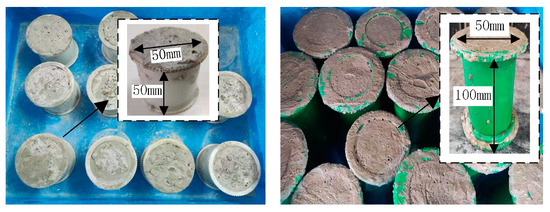 As shown in Figure 8c, the strength of the GCB is the lowest when the aggregate grading is 0.65, so this aggregate grading was employed for the sake of engineering safety. Under the optimal ratio of the slurry (a water–cement ratio of 2.5:1 and a cement–sand ratio of 1:4) and the aggregate grading for the most unfavorable crushed-stone particle size distribution (0.65), GCB specimens were prepared, the process and requirements for specimen preparation being the same as those in Section 3.1. Figure 13 provides photographs of cylindrical GCB specimens that have been cemented.