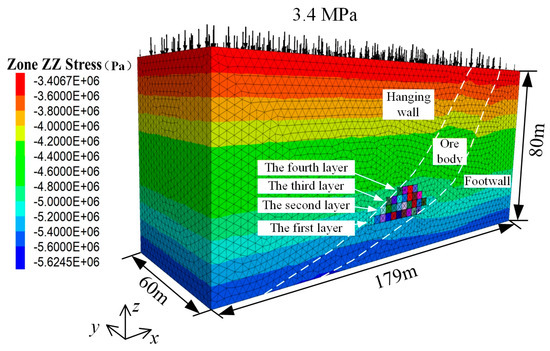 The boundary conditions of the numerical model are as follows: (I) horizontal displacement constraints in the Y-direction are set on the front and rear sides of the model boundary; (II) horizontal displacement constraints in the X-direction are set on the left and right sides of the model; (III) complete displacement constraints the X-, Y-, and Z-directions are set at the bottom of the model; and (IV) in view of the actual mining geologic conditions, a vertical stress with a magnitude of 3.4 MPa is applied at the top of the model.