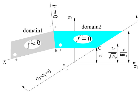 The ore body model was built by stretching the ore body cross-sectional shape (Figure 1) along the strike for 60 m. Given that the ore occurrence changes insignificantly along the strike, the elevation changes in the ore body, the roof, and the floor in the stretching direction were not considered. Meanwhile, to reduce the influence of the mining-induced boundary effect, 20 m was added on both sides beyond the range of mining activities, and the finalized numerical model size was 179 m × 60 m × 80 m (Figure 15). The Mohr–Coulomb model was chosen as the constitutive model of the ore-rock body for this numerical simulation. The instability criterion used in the Mohr–Coulomb model includes the tensile intercept. As shown in Figure 16, the segment from Point A to Point B is defined based on the Mohr–Coulomb instability strength f s = 0, and that from Point B to Point C is defined based on the tensile instability criterion f t = 0 from. In addition, by introducing the function h(σ1, σ3) = 0, the Mohr–Coulomb model is defined as the diagonal line between f s = 0 and f t = 0 on the (σ1, σ3) plane. If the stress point is located within Domain 1, the point is in a shear yield state, and if the stress point falls within Domain 2, the point is in a tensile yield state. Based on the experimental results and existing studies [33,34], the mechanical parameters of the ore-rock body and the GCB in this simulation were determined (Table 6).