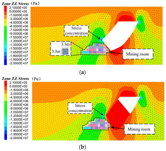 As depicted in Figure 17, the stress becomes obviously concentrated in the surrounding rock of the goaf after the mining of the ore body above the 459 m level. The maximum stress in the surrounding rock in the vertical direction reaches approximately 20 MPa, which is about 4 times the original stress there (approximately 5 MPa). However, stress concentration in the surrounding rock is noticeably weakened after the stope is filled with the GCB. The maximum stress in the surrounding rock in the vertical direction is reduced to about 13.5 MPa, approximately 2.5 times the original stress there. This phenomenon demonstrates the important protective effect of the GCB on the stope below.