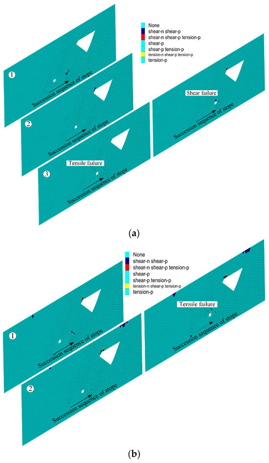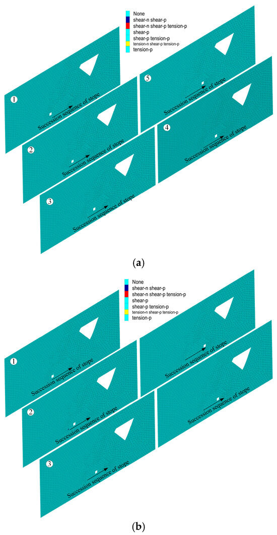 Miaoling Gold Mine adopts the upward horizontal slicing step-and-fill mining method to recover the ore body below the goaf. The ore body below the goaf is divided into four layers for mining, i.e., the first, second, third, and fourth layers from the bottom to the top, which are mined in two steps, respectively (Figure 16). In the numerical simulation, the plastic zone reflects the failure state of the rock mass, so the plastic zone distribution of the surrounding rock of the mine rooms is taken as the evaluation index of the stope stability here. During the excavation process of the mining rooms, only the current failure state of the surrounding rock is related to the stability of the mining rooms. In view of this fact, the failure of the plastic zone in the numerical simulation only considers the current failure state of the surrounding rock.