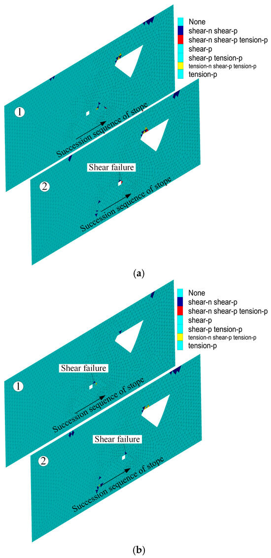 Figure 21 exhibits the plastic zone distribution of the surrounding rock of the mining rooms during the mining of the ore body in the fourth layer. After the first mining step, the roof and side of a mining room near the goaf suffer shear failure. After the second mining step, the shoulder of the mining room also undergoes shear failure.