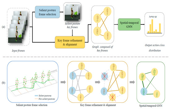 Overview of our MSKFS. (a) Architecture of the proposed method. The skeleton data involved in video frames are inputted into the modules of salient posture frame selection and key frame refinement and alignment, where the output salient posture frames of the former module are regarded as the prior for refining and aligning the selected frames of the latter module. The skeleton structures in the selected frames can thus be constructed as a spatial–temporal graph and fed into a GNN to generate the final predicted action category. (b) Data flow through three main modules of our method. In the salient posture frame selection, the salient postures are selected from the uniformly sampled frames from the input sequence. In the key frame refinement and alignment, we refine the selection of key frames as the graph nodes with the guidance of salient postures. In the spatial–temporal GNN, the edges of the graph can be further refined and the information of each graph can be propagated to represent the action.