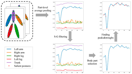 Example data flow of the proposed salient posture frame selection based on the global dynamics of body parts. The global dynamics of different body parts are plotted with curves in different colors. The salient postures can be reflected by dynamic changes.