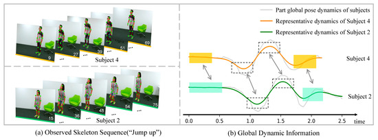 Figure 3 shows a pair of the representative dynamics of the body part “left leg” of an action “jump up” displayed by two subjects as an example. The action is composed of five phases: stand (before jump), squat (before jump), jump, squat (after jump) and stand (after jump). We find that the changes in actions conducted by the two subjects are consistent, thus extracting representative frames of the corresponding phases according to the dynamics can help to align the inter-class actions and generate temporal scale-invariant representations. From the figure, we also observe that the phase of standing upright is dispensable for the “jump up” action recognition, and the other phases are more necessary and discriminative. Frames at time steps with high volatility in the dynamics can just satisfy the aforementioned characteristics.