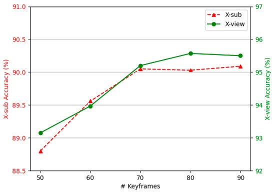 In this part, we analyze the effects of different lengths of selected key frame sequences. How key frame length affects the action recognition performance is explored within the context of the NTU RGB+D 60 dataset. According to the key frame selection and refinement method in this paper, this section validates the effect of key frame length on classification performance using the joint modality under the X-sub and X-view split criteria. The accuracy of the action recognition task as it relates to key frame length is shown in Figure 4. For the X-sub setting, when the number of frames is less than 70, the recognition accuracy is highly sensitive to sequence length. Between 50 and 70 frames, the model’s recognition accuracy significantly increases from 89.2% to 90.2%. This phenomenon may be due to an insufficient number of key frames where the model cannot capture enough motion information, leading to improved recognition accuracy as the number of key frames increases. When the frame length reaches 70, the accuracy does not rise significantly anymore but instead shows a certain decrease (at 80 frames), which could be mainly attributed to the inclusion of too many key frames, leading to redundant or noisy frames in the optimized skeleton sequence, thereby hindering the performance of the model. As the key frame length increases to 90, the task’s accuracy experiences a slight increase but is almost indistinguishable from when the length is 70 frames. Therefore, for the X-sub setting, we select a key frame length of 70 to maximally include useful motion information while ensuring recognition accuracy and considering the computational efficiency of the model. Similarly, for the X-view setting, we choose a key frame length of 80. Considering that the average length of salient pose frames across all samples is approximately equal to 12, we set Tinit = 20.