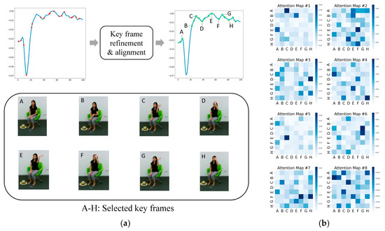 Visualization of (a) the key frame selection and alignment procedure and (b) the attention maps of the selected key frames. A–H are selected key frames.