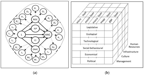 The second one is based on the definition of POE resilience [13], which mentions that POE resilience is the organizational ecosystem’s capacity to absorb shocks, adapt to change, and maintain essential functions in the face of unforeseen events, driven by strong leadership and the ecosystem’s inherent ability to learn and evolve. It is not merely the sum of individual organizations’ resilience, but a complex system property that requires holistic analysis and management strategies. As such, the definition includes the four main components of organizational resilience, focusing on internal aspects of the POE (Figure 1a): the critical infrastructure component (CI); human resources challenges (ILPs); management skills (OMCs); and organizational culture (ROC) [13]. And all these components have to be managed by flexible leadership (L) principles and decision-making for the improvement of adaptive capacity (AAC) in the whole ecosystem for keeping high resilience under the influence of uncertainties (Figure 1a).