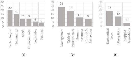 Frequencies of challenges (a,b) and impacts (c) according to the results of focus group discussion: (a) classification by political, economic, social, environmental, and legislative factorial field; (b) classification by components of POE resilience; and (c) classification by negative impact. Experts mentioned 63 challenges (a,b) and 35 impacts (c) during discussion.