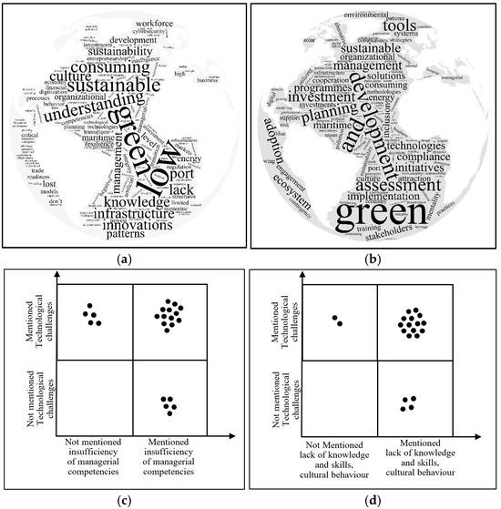 Visualization diagrams representing focus group interview results: (a) word cloud drawing presenting the dominant challenges for POEs; (b) word cloud drawing presenting effective managerial interventions for resisting challenges; (c) results of cross-content analysis for estimating the relationship between technological and managerial challenges; and (d) results of cross-content analysis for estimating the relationship between technological and soft organizational challenges such as knowledge, skills, and culture. In pictures (c,d) the frequency of of experts’ asnswers on specific object from specific category are presented by black points.